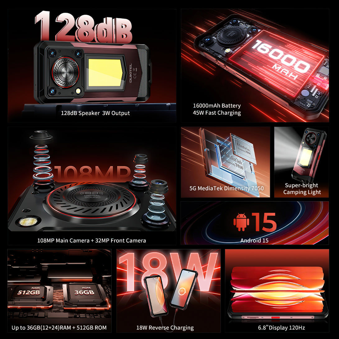 Oukitel WP56 5G Rugged Phone 6.8''FHD+Display 16000mAh Big Battery 108MP Camera Android 15(12GB+512GB NFC)